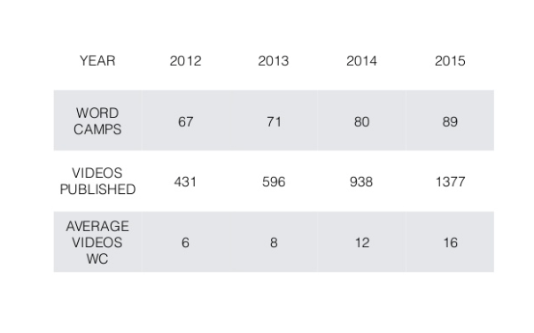 As we know, the number of WordCamps has been steadily increasing over the years. So too have the number of videos being published. BUT what has caught my attention is the large increase of videos coming from WordCamps. In 2012 the average number of videos published was 6 per WordCamp. In 2015 that number grew to 16 published videos per WordCamp. Some WordCamps are able to hire profession firms to record, edit and upload videos but the majority of video content is recorded by volunteers. You can see below the actual numbers below. FYI: as of todays date, over 1100 videos have been published for 2016. Let’s give a big shout out to the volunteers who are helping with this effort.